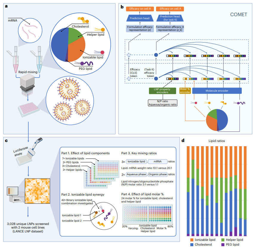 در این مقاله، پژوهشگران با تلفیق داده های گسترده ی تجربی و رویکردهای هوش مصنوعی پیشرفته، مدل جدیدی به نام COMET (Composite Material Transformer) ارائه کرده اند که بر پایه شبکه عصبی ترنسفورمر ساخته شده است. این مدل با بهره گیری از یکی از بزرگترین بانک های داده ای موجود (LANCE) شامل بیش از ۳۰۰۰ نمونه مختلف فرمولاسیون LNP، آموزش دیده است و هدف آن پیش بینی عملکرد، اثربخشی و پایداری فرمولاسیون های مرسوم و نوظهور با سرعت و دقت بالا میباشد.