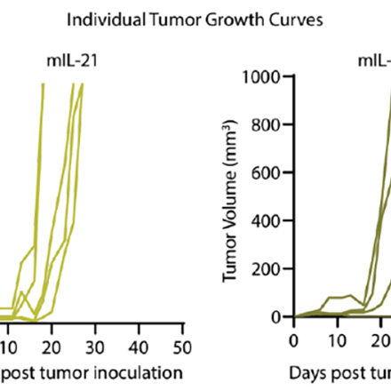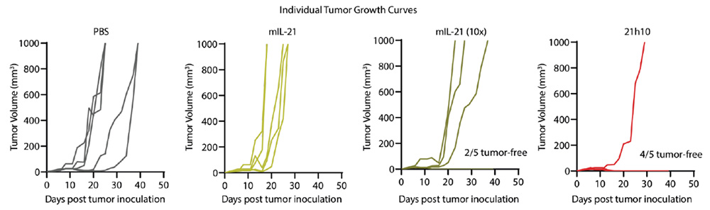 در مدل‌های ارگانوتیپیک موشی و ex vivo انسانی، 21h10 فعالیت ضدتوموری قدرتمندی بروز می‌دهد که از نظر مدت زمان و شدت سیگنال‌دهی، برتر از IL-21 طبیعی است و نفوذ عمیق‌تر به بافت تومور را ممکن می‌سازد. درمان با 21h10 حجم تومور را کاهش و بقای حیوانات را افزایش داد، که با ایمونوهیستوشیمی تأیید شده است. با این حال، در موش‌ها پانکراتیت حاد مشاهده گردید، که با مهار TNF-α (مانند اتانرسپت) بدون اختلال در اثربخشی ضدتوموری، کنترل شد. علاوه بر این، علی‌رغم تشکیل آنتی‌بادی‌های ضددارویی علیه 21h10 در موش‌ها، این آنتی‌بادی‌ها ماهیت غیرخنثی‌کننده (non-neutralizing) داشتند؛ در نتیجه، موش‌ها همچنان قادر به پاسخ‌دهی ایمنی به درمان‌های بعدی با 21h10 بودند، که این امر پایداری طولانی‌مدت درمان را تضمین می‌کند.