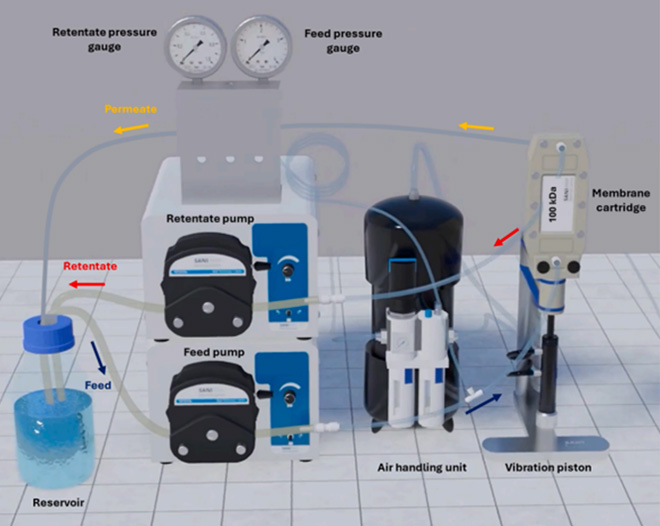 در مطالعه‌ای که اخیراً انجام شد، برای اولین‌بار از فناوری Vibro-Membrane Filtration (VMF) در ترکیب با SPTFF استفاده شد؛ روشی که با ایجاد لرزش‌های کنترل‌شده در ممبران، شدت پدیده‌ی تجمع مواد (Concentration Polarization) را کاهش می‌دهد و اجازه می‌دهد فرایند با سرعت بسیار بالاتری انجام شود.