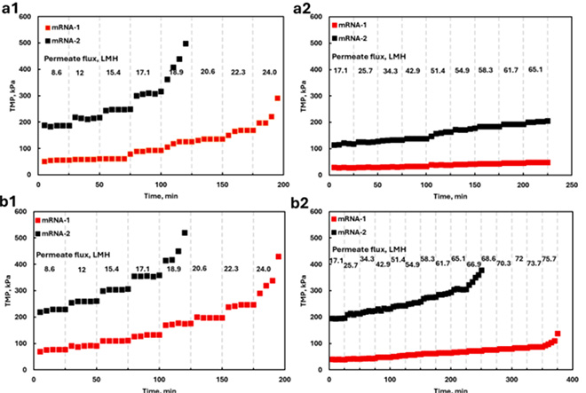 شکل ۲: آزمایش‌های جریان مرحله‌ای با mRNA-1 و mRNA-2 روی غشاهای پلی‌اتر سولفون با سطح ۳۵ سانتی‌متر مربع در نرخ جریان خوراک (a) ۴ و (b) ۵ میلی‌لیتر در دقیقه. پانل‌های ۱ بدون لرزش و پانل‌های ۲ با لرزش نشان داده شده‌اند.