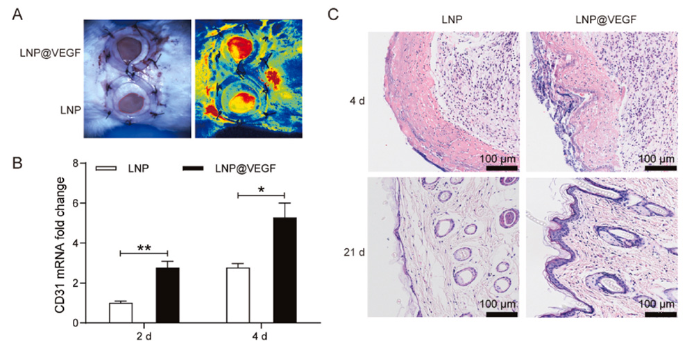در مدل پوست تمامقطعی موش BALB/c، کاربرد موضعی LNP@VEGF )۱۰ µg در روز۰ و روز۳) موجب بیان انسانی VEGF-A در بافت زخم شد، نرخ بستهشدن زخم را در هفت روز اول بهبود بخشید، و تصویربرداری لیزر اسپکل نشان از افزایش پرفیوژن خون در منطقه زخم داشت. بیان نشانگر اندوتلیال CD31 در روزهای ۲ و ۴ بالا رفت و هیستولوژی نشاندهنده بافت گرانولاسیون ضخیمتر، اپیتلیال شدن کاملتر و بازسازی ساختار پاپیلاری در روز ۲۰ بود؛ نکته مهم اینکه اِدِم یا نشت عروقی غیرطبیعی مشاهده نشد، که مزیتی نسبت به تجویز پروتئین VEGF خام است.