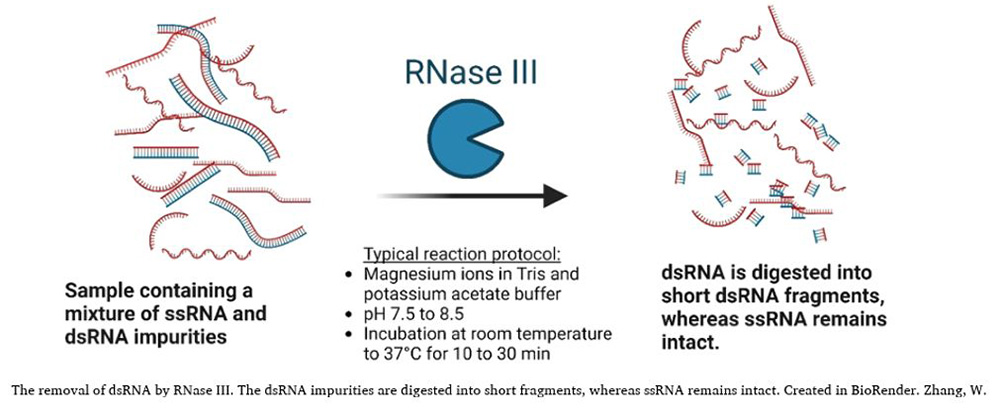 ریبونوکلئاز III با تجزیه انتخابی dsRNA، خلوص mRNA را افزایش میدهد؛ اما حذف کامل این آنزیم، برای جلوگیری از واکنشهای ایمنی ضروری است و فرآیند را دشوارتر میکند.