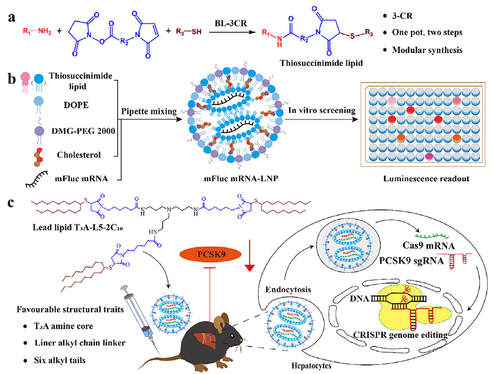 روند سنتز لیپید تیوسوکسینیماید، مراحل ساخت نانوذره هدفمند و نحوه عملکرد آن در انتقال mRNA و ویرایش ژن PCSK9 به واسطه سیستم CRISPR/Cas9