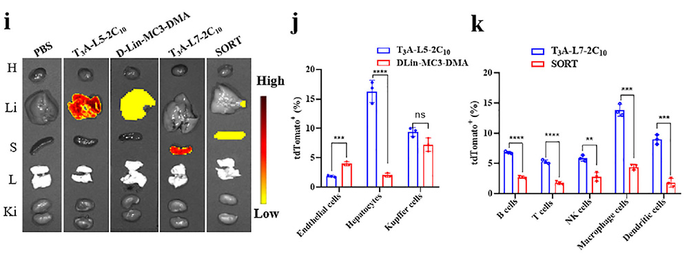در طی غربالگری بیش از ۳۴۴ ترکیب، ساختار T3A-L5-2C10 به عنوان لیپید برتر شناخته شد. این ترکیب با دارا بودن سه گروه آمینی، اتصالدهنده آلکیل زنجیرهدار (L5) و شش زنجیره شاخهدار، انتقال mRNA لوسیفراز را در سلولهای HeLa تا ۲۲ برابر بهتر از لیپید استاندارد DLin-MC3-DMA و تا ۴۵ برابر Lipid 5 افزایش داد. آزمایشهای in vivo نشان دادند که BL آلکیلدار موجب تجمع نانوذره در کبد (liver-tropic)، در حالی که BL پگدار هدفمندی به طحال (spleen-tropic) را ایجاد میکند؛ این تفاوت با آنالیز پروتئومیک کُرونای پروتئینی سطح LNPها بهخوبی اثبات شد. آلفاپروتئین ApoE بر سطح نمونههای کبدی و GAS6 بر سطح نمونههای طحالی غالب بود که با مسیر انتقال زیستی آنها هماهنگی داشت. همچنین، تستهای حیوانی با تزریق Cas9 mRNA و sgRNA هدفمند علیه ژن PCSK9، نشان داد که T3A-L5-2C10 سبب کاهش ۸۱٪ سطح PCSK9 و ایجاد ٪۱۴.۶ جهش حذف و اضافه در ژن گردید (۶۲ برابر اثر بخش تر از لیپید مرجع)، بدون هیچگونه نشانهای از سمیت اندامی یا التهاب.