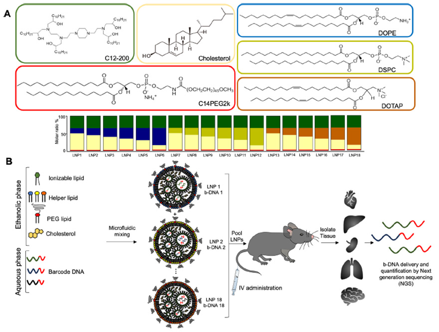 نسبت بالای DOPE و کاهش کلسترول، مشخصا کارایی عبور از اندوزوم و ترجمه ژن را تقویت کرد؛ نتایج نشان دادند که کدگذاری بوسیله بارکد DNA برای غربالگری مستقیم in vivo نسبت به روش‌های بر پایه رنگ fluorescent زیان‌های کمتری داشته و تفسیر دقیق‌تر را فراهم آورده. جایگزینی لیپید یونیزه‌شونده با گزینه‌های تاییدشده SM-102) FDA ،(ALC-0315  کارایی ترانسفکشن را افزایش نداد و نشان داد که فرمولاسیون بهینه اهمیت بیشتری نسبت به تاییدیه بالینی اولیه دارد.