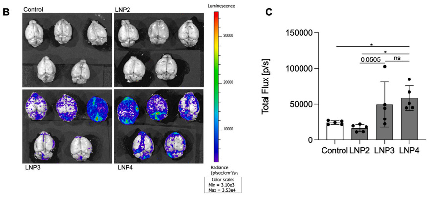 در این مطالعه، کتابخانه‌ای متنوع از LNPها با انواع مختلف لیپیدهای کمکی DOPE ، DSPC،  DOTAPو نسبت‌های مولی گوناگون ساخته شد. هر LNP حاوی یک بارکد  DNA خاص بود که پس از تزریق به موش‌ها، توسط توالی‌یابی نسل جدید (NGS) ردیابی و شناسایی شد. غربالگری بارکد، کارآمدترین فرمولاسیون‌ها را برای انتقال به مغز یافت و سپس کارایی این LNPها در ترانسفکشن سلول‌های عصبی رده اولیه و مدل‌های حیوانی مورد سنجش قرار گرفت. کتابخانه ۱۸‌تایی فرمولاسیون LNP با روش میکروفلوئیدیک ساخته شد که اندازه ذرات ۷۵ تا ۱۷۰ نانومتر و بار سطحی بهینه را نشان داد LNP.های مبتنی بر DOPE بیشترین انتقال به مغز و کارایی در ترانسفکشن سلول‌های عصبی را داشتند؛ DOTAP  گزینه دوم و DSPC )مورد استفاده در واکسن mRNA کووید ۱۹( عملکرد ضعیف‌تری نشان داد. نوع و نسبت لیپید کمکی تعیین‌کننده خاصیت هدفمندی و ظرفیت عبور از BBB بود. فرمولاسیون منتخب (LNP4) با درصد بالای DOPE، موفق شد بیان ژنی لوسیفراز را پس از تزریق وریدی در مغز موش‌ها ایجاد کند.