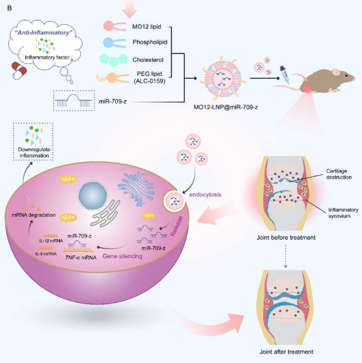 در مدل موشی CIA،MO12-LNP@miR-709-z زمان گردش سیستمیک miR-709-z را افزایش داد و تجمع اختصاصی در مفاصل مچ پای ملتهب را نشان داد و سیگنال فلورسانس حتی ۲۴ ساعت پس از تزریق در مفاصل ملتهب حفظ شد، در حالی که miRNA آزاد بهسرعت تخریب شد. درمان با MO12-LNP@miR-709-z بهطور مؤثر التهاب مچ پا را کاهش داد، امتیاز بالینی آرتریت از ۱۱ به ۶.۲۵ رسید و ضخامت پنجه موشها ۱.۳۵ برابر کمتر از گروه کنترل شد. تحلیلهای بافتشناسی نشان داد که MO12-LNP@miR-709-z تخریب استخوان و غضروف را کاهش داد و نفوذ سلولهای ایمنی را مهار کرد.
